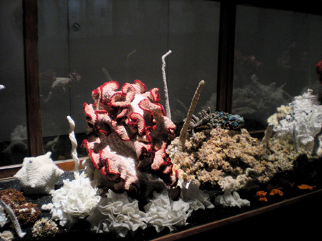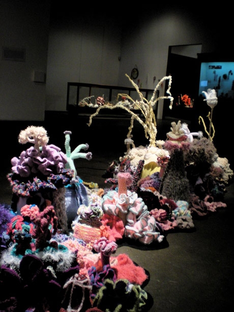 The collection of works made by the Core Reef Crafters constitutes the Crochet Coral Reef, a work of art owned by and exhibited under the auspices of the Institute For Figuring. Margaret and Christine also act as Curators of the Crochet Reef and take personal charge of the installation of these works in every exhibition venue. As of March 2009 the CCR has been exhibited at the Andy Warhol Museum (Pittsburg 2007), the Chicago Cultural Center (Chicago 2007), NYU’s Broadway Windows (NYC 2008), World Financial Center Winter Garden (NYC 2008), The Hayward (London 2008), and Track 16 Gallery (Los Angeles 2009). Further exhibitions of the CCR are scheduled for the Scottsdale Civic Center Library (Spring/Summer 2009), the Smithsonian’s National Museum of Natural History (Washington DC, 2010/2011), and discussions are under way with several other exhibitors.