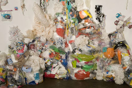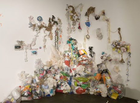 The IFF "Midden" at Track 16 Gallery, 2009. Surrounded here by a flock of plastic trash "Midden Monsters" crocheted by Christine Wertheim and Evelyn Hardin. Adorning the heap are large anemone-forms finger crocheted from Shrink Wrap by Pate Conaway.