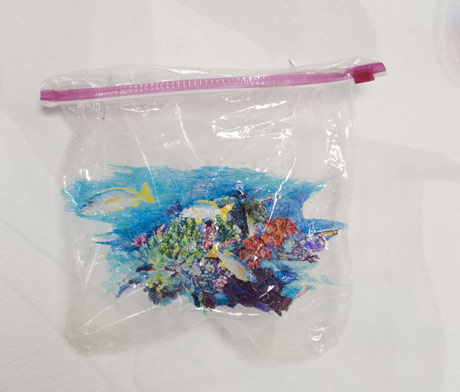 Plastic bag seascape, drawn with sharpies by Alicia Escott. Photographed at Track 16 Gallery, Los Angeles (2009).