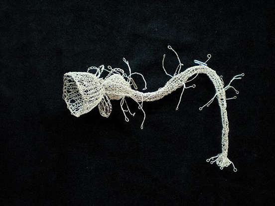We first encountered Anita when she contributed several medusa-like models to the UK Reef in 2008. These beautiful forms, so reminiscent of Ernst Haeckel's delicately lovely drawings of living medusas were in fact crocheted, out of fine wire and string. We were enchanted and asked to see more. The body of work she produced out of a tupperware box at the opening of the UK exhibition at The Hayward blew our minds. Here was an entire invented taxonomy of magical sea creatures, all knitted out of fine scientific wire. Over several years Anita had been pursuing her own evolutionary path, beginning with very simple forms then letting the process of stitching guide the development of the 'organisms' into increasingly complex structures. Like us, she too was proceeding along a private Darwinian path, allowing the inner nature of her work to develop and grow organically.