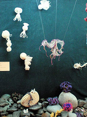 A flotilla of Anita Bruce's knitted sea creatures, hanging at Track 16 Gallery in Los Angeles (2009) along with beaded medusa by Vonda N McIntyre. At bottom, among the rocks, are beaded corals by Vonda and Sue Von Ohlsen, plus beaded kelps by Diana Simons and Sarah Simons.