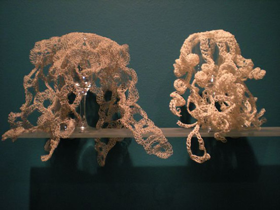 Medusa forms by Anita - crocheted wire (left) and crocheted string (right) - shown here as they were installed in the Crochet Reef exhibition at The Hayward (2008)