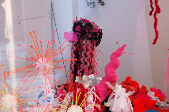 Giant Orange crochet coral by Christine in the Toxic Reef, New York. At far left is a beautiful plastic crochet brain coral by Sien Chu Kerk. At back is a plastic and yarn pillar coral by Kristine Brandel; at far right we see Ildiko's electric forms. Photo by Helen Wall.
