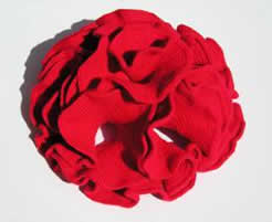Pictured here is a very large red symmetric hyperbolic plane. On the left is the unwrapped configuration, which is the same structure as the ball-like models pictured above. Indeed all the forms on this page are exactly the same structure - they have just ben wrapped in different ways. On the right-hand side here we see the red model wrapped into 10 "flutes". This is just one of many wrappings that can be made of the form. Unlike a flat sheet of euclidean paper, which can only be wrapped into a simple cylinder or cone, a piece of "hyperbolic paper" can be wrapped into any number of flutes without deforming its geometry. Each different wrapping is formally known as "an emdbedding in 3-space." It is extremely difficult to imagine such complex embeddings, but Dr Taimina's crochet models make such abstract mathematical properties visible to our eyes.