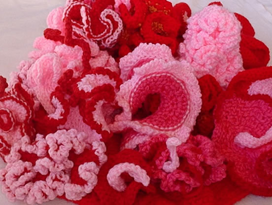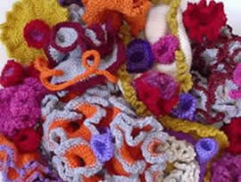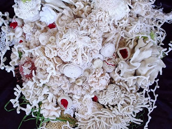 In 2006 someone began emailing us photos out of the blue. They were labeled provocatively, and without further explanation, as simply "The Other Crochet Reef." The images were astonishing, psychaedelic combinations of reds and pinks and electric blues, channeled through a pop sensibility that immediately resonated with us both. The only hint about their creator was the enigmatic designation at the end of the emails - they'd been sent by Dr Axt. We had no idea who this person was and she (or was it a he?) made no attempts to enlighten us further, nor to elicit any instructions or guidance or input from us. Whoever was sending these amazing images was paralleling our own effort to create a crochet reef entirely on their own.