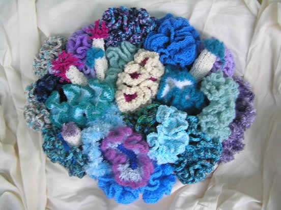Gina is a contributor to the Melbourne Reef, which was initiated in 2009 by Australian crafter Tracy Hayllar - a pretty remarkable woman herself. Tracy taught Gina how to make crochet corals with the help of a deaf interpreter who read Tracy's lips and translated what she said into sign language. Gina then "felt the hands of the translator" as she signed the information. Tracy introduced Gina to a series of crochet models so that she could learn "how to count stitches by feel." The photo above shows Gina with a selection of her corals, which will be included in the debut exhibition of the Melbourne Reef at the Burrinja Community Cultural Center (opening October 2010).