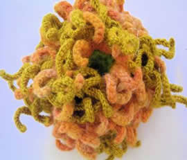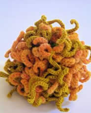 Helen was our very first international contributor and has remained one of our most creative. Above is one of her octopus organisms, a whole genre of crochet-sea-creatures she invented. The tentacles on these models end in hyperbolic "curlicues," which are a traditional crochet embellishment - though we believe Helen discovered it for herself. Helen is a master of both technique and form and over the past 2 years has produced an extraordinary variety of complex, multi-faceted shapes. Every time a box arrives from her we marvel again at the diversity of her imagination - she seems to be single-handedly creating several major new branches on the crochet tree-of-life.