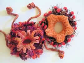 Above is a particularly exquisite anemone Helen has made. The central body is covered in orange and mustard tentacles each given a gentle twist by a slight hyperbolicization (increasing stitches). Holding this furry delight in your hands it is so full of life you can almost feel it breathing. Below are two more of Helen's amazingly inventive patterns: when they arrived in their box they were nestled on top of one another as if they were mating. We like to imagine them as the male and female of a species and we sincerely hope that one day we will be priviledged to see their offspring. Note the attention to detail here. The delicate filigree edgings, the complexity of structure, and the five-fold symmetry are all so reminiscent of Ernst Haeckel's beautiful marine drawings.