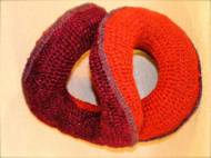Before she moved to the country to tend sheep and get closer to nature, Helen had a career as a computer programmer and math teacher. For several years she programmed COBOL for mainframes in Switzerland. Her love of mathematics comes through in the complicated structures that lie at the heart of many of her crochet models. Beneath the tentacles many of these creatures are in the form of a mobius strip. These moboid-models have the property that they appear to be eating themselves and can continually pulled through a central omphalous.
