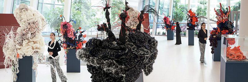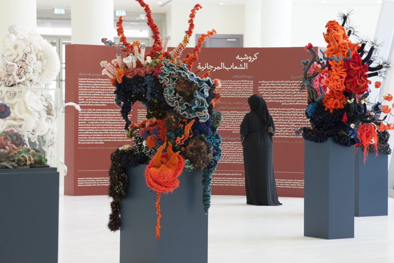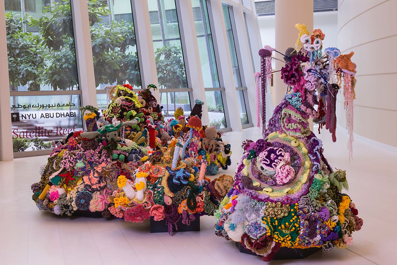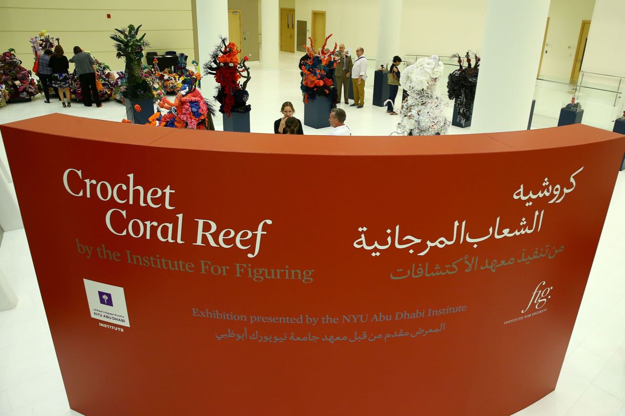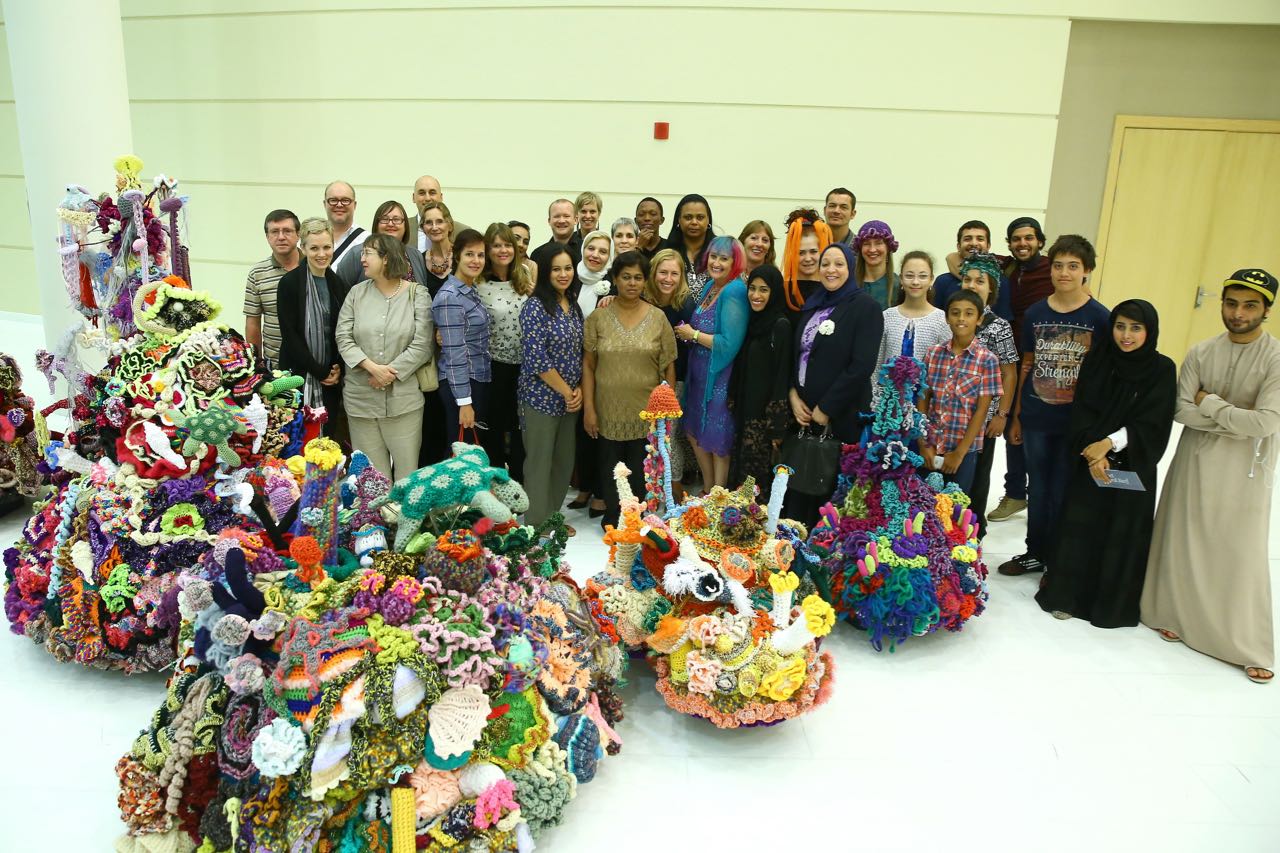 In Fall 2014, the IFF's Crochet Coral Reef traveled to the NYU Abu Dhabi Institute in the United Arab Emirates. The Middle East is home to a network of unique coral reefs, as well as to an explosion of human-made development, thus making the region a fertile place for both the aesthetic pleasures and the ecological consciousness-raising of the CCR project.