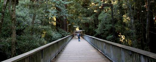 The UC Santa Cruz campus is located in the middle of a redwood forest, with walking paths winding through its hilly terrain.