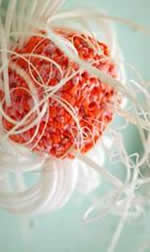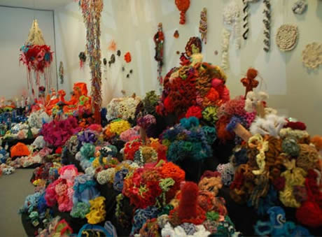 As a sister exhibition to the Broadway Windows site, a second exhibition will be on show at the World Financial Center, Winter Garden. On display here will be the IFF's yarn-and-plastic-extravaganza, the Toxic Reef. The Winter Garden show will mark the debut appearance of the Rubbish Vortex, crocheted entirely from plastic shopping bags by IFF Australian contributor Helle Jorgensen. On display will also be a large cloud of plastic jellyfish forms by Irish contributor Inga Hamilton, Cambrian Explosion forms by Aviva Alter, hyperbolic octopii by Helen Bernasconi, Reefer Madness forms by Dr Axt, plastic diatoms by Evelyn Hardin, and beaded hyperbolic marvels by Rebecca Peapples and Sue Von Ohlsen.