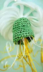 Left: Crochet plastic diatom form, with cable ties, by Evelyn Hardin. Middle and Right: Crochet plastic jelly-fish by Inga Hamilton.