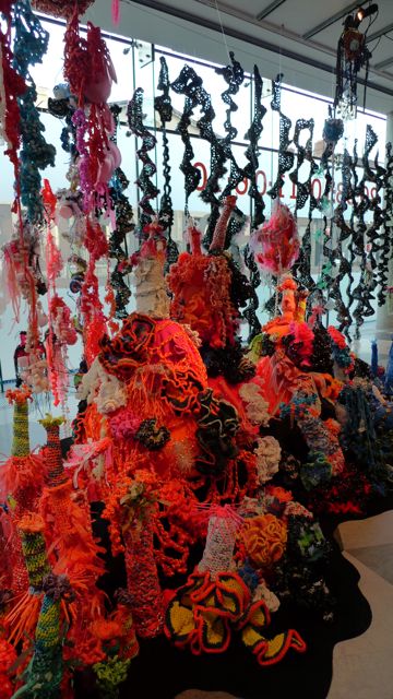 Another vibrant ‘pod’ from the Latvian Reef, hanging in front of the IFF’s signature orange wall. In the background is our classic Carnation Coral Mound with Tendrils by Marianne Midelberg and Sarah Simons and a glimpse through to the Ladies Silurian Green (Kelp) Reef.