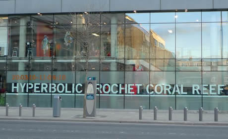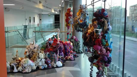 During Spring 2010 the Crochet Reef was on exhibition at the Science Gallery at Trinity College in Dublin. This unique show marks the first time the Reef has been exhibited at a science institution and the installation included several new features designed to highlight the science and mathematics behind the project, including a specially built "Maths Chapel" and on-site science-trained 'mediators' who interacted with audiences and served as Reef tour guides. The exhibition also marked the Reef's second international showing after its installation at The Hayward in 2008.
