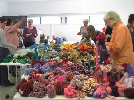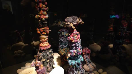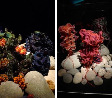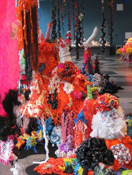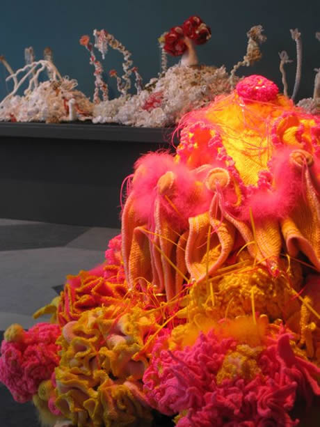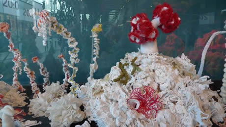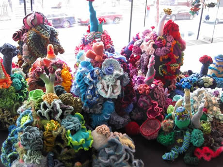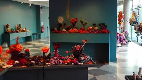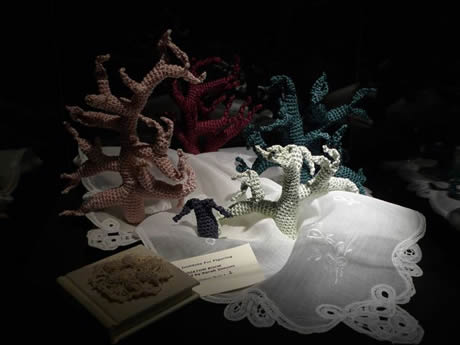 The Irish Reef: We had always known that the women of Ireland would bring a special Gaelic flair to the Reef and we weren't disappointed. During late 2009 and early 2010 women across Ireland began making corals, bringing to bear an extremely high level of craft skill. Over 5 months a massive amount of work was produced that in the final weeks was orchestrated into a series of beautifully color-coordinated mounds, including several very lovely white mounds - the Irish response to coral bleaching. In addition to the main installation, a selection of very fine Irish works were curated on a separate pedestal as the Irish Precious Reef. All thanks to Irene Lundgaard and Orla Breslin for their brilliant spearheading and curatorial style.