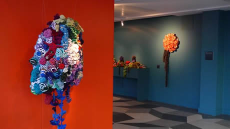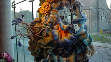 The Latvian Reef (detail). A special feature of the Latvian Reef, which is showing on the second floor of the Dublin gallery along with the Irish Reef, is several ingeniously composed hanging ‘pods’ that bring together the work of many individual Latvian crafters in an anthropomorphic dangling delight.