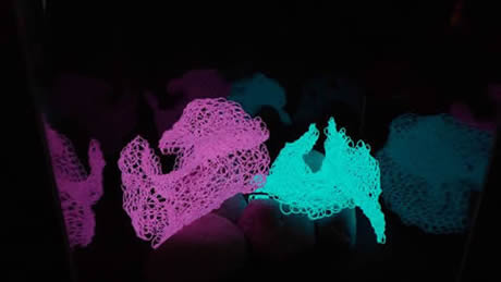 'Holy Jewel Room’ vitrine featuring electroluminescent wire coral pieces by Eleanor Kent.