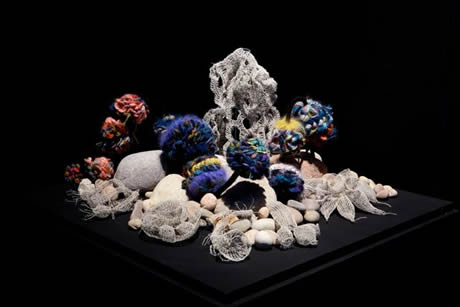 'Holy Jewel Room’ vitrine featuring staghorn corals by our new Japanese contributor Mieko Fukuhara. Each of these delicately grown pieces has a small magnet crocheted into its ‘roots’ to make it elegantly free-standing! In the foreground is Sarah Simon’s tiny, precisely-designed Diatom Book.