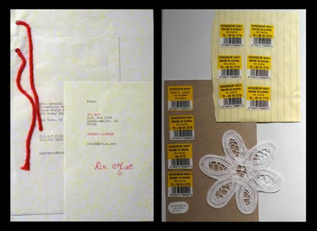 Two of the ‘Holy Documents’: To the left are letters from Dr. Axt, while on the right are price tags from purchased doilies made by anonymous Chinese factory workers.
