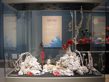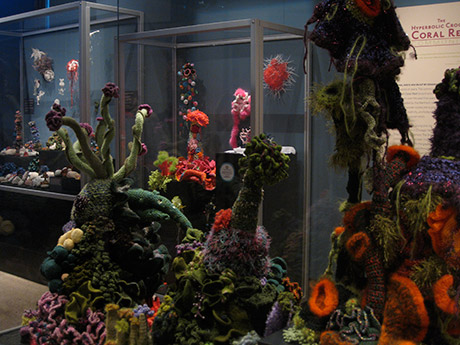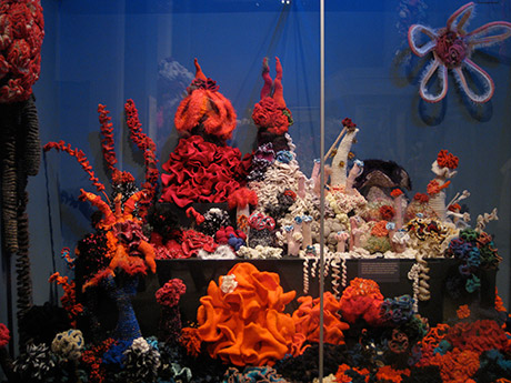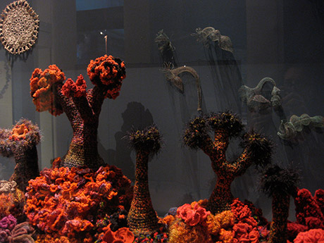 Here, a specially-curated version of the Ladies Silurian Reef is presented as a gracefully sprawling mound with Cat-in-the-Hat overtones. Featuring giant orange corals by Christine Wertheim, white spires by Evelyn Hardin, pale-pink anemone grove by Heather McCarren, carnation coral mound (at left) by Marianne Middelberg, giant diatom (at top right) by Scottsdale Reef crafters.