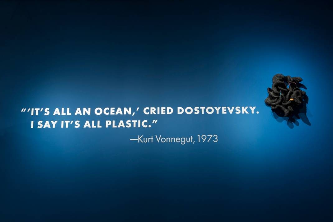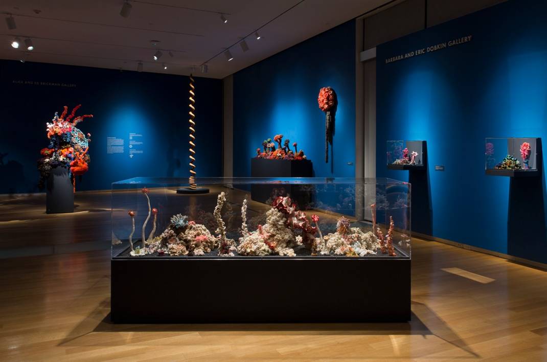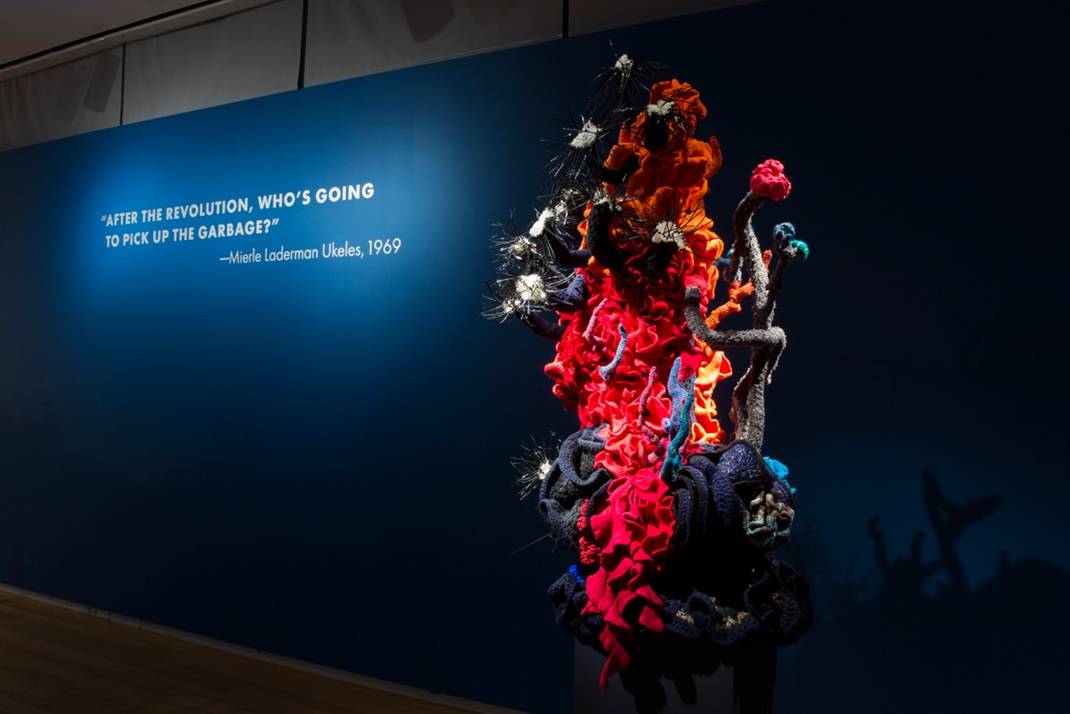 This exhibition consists of three main “habitats.” A giant Coral Forest and a collection of miniature Pod Worlds represent the diversity of living corals through the varying textures, colors, and forms of crocheted yarn and beads. A Bleached Reef and a brand new Toxic Reef serve as invocations of dying corals, while The Midden—four years’ worth of the Wertheims’ own domestic plastic trash—constitutes a deeply personal response to the issue of plastic waste in the oceans, including human-made phenomena such as the Great Pacific Garbage Patch. Mixing environmental science with science fiction, the Crochet Coral Reef calls us into what Donna Haraway has called "a time of response-ability" and sisterhood with the sea.