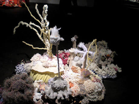 - The Bleached Reef (always an audience favorite), which here includes tiny new beaded crochet wonders by Nadia Severns, plus a mound of starched doillie crocheted by unknown Chinese factory workers, Marianne Midelberg’s red and white sea slug, Jill Schreier’s miniature beaded crochet corals, and many other amazements.
