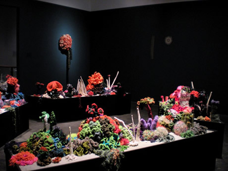 Detail of the Specimen case, featuring Ildiko Szabo's flourescent corals, Arlene Mintzer's black plastic jelly-yarn corals, and Anitra Menning's architectonic hyperbolic planes.