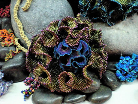 The Specimen Case, detail. Tiny Byzantine beaded hyperbolics by Rebecca Peapples and beaded kelps by Sarah Simons.