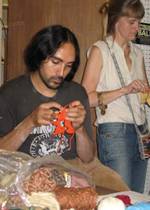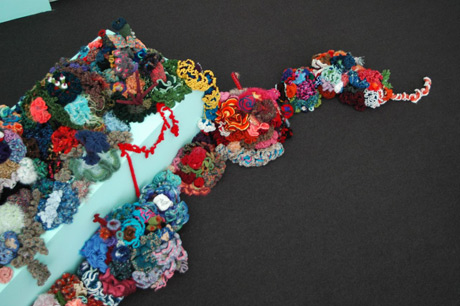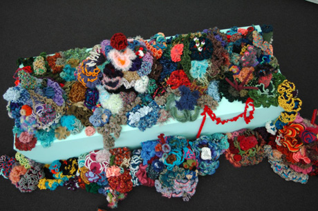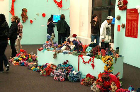 The first Crochet Reef offshoot took root in Chicago during the summer and fall of 2007. Under the auspices of the Jane Addams Hull-House Museum, more than 100 Windy City residents came together in workshops and started making coral forms. Chicagoans young and old, male and female, experts and novices in the art of crochet, gathered in community centers, art studios, living rooms and yarn stores to learn how to fashion their own woolly wonders. This city-wide happening was spearheaded by Hull-House's mega-dynamic director Lisa Yun Lee ,and by Catherine Chandler, who acted as crafter-curator-and-wrangler-in-chief to this multi-tentacled marvel. Workshops were held at Hull-House, at the Lillstreet Art Center, at the Arcadia yarn-store and other venues. The Rainbow Angels Girls Crochet Circle - a committed group of teens - got involved. The result was the extraordinary "Chicago Reef," which was shown along with the IFF Reefs at the Chicago Cultural Center in late 2007 in a major exhibition held in association with the Chicago Festival of the Humanities, whose theme this year was "Climate of Concern".