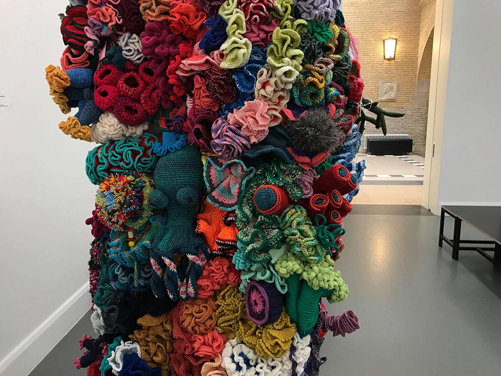 Throughout the exhibition, the local community will be crocheting an Eindhoven Satellite Reef, a participatory sculpture connecting the Brabant river Dommel with the Great Barrier Reef in Australia. This crocheted reef will spread from the central hall of the exhibition to other places in Eindhoven and Brabant, symbolizing how we are all connected with and to each other. Visitors can add their crocheted items to the exhibition in person, or send them to the museum who we will incorporate them into the installation: