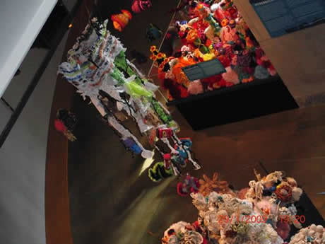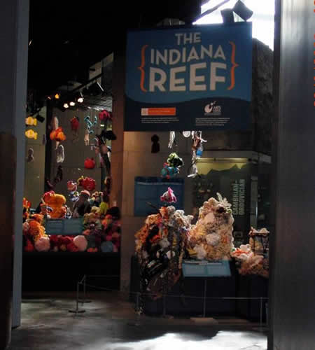 The Indiana Reef began in 2009 with its first exhibition planned for the Fall of 2010 at the Indiana State Museum. From the beginning, this local Reef was full-steam ahead, attracting hundreds of dedicated crafters, some of whom worked on-site in the Museum each week as a kind of 'coming attraction' demonstration of hyperbolic crochet. Lovingly coordinated by Carol Frohlich of the Crochet Guild of Indianapolis, the Indiana Reef captivated the crochet hooks of dedicated Mid-Westerners for many months. These Reefers grew wildly-colored coral as well as schools upon schools of....fish!! Ultimately the Indiana Reef features many beautifully composed 'mounds' that are guarded over by the hanging fish.
