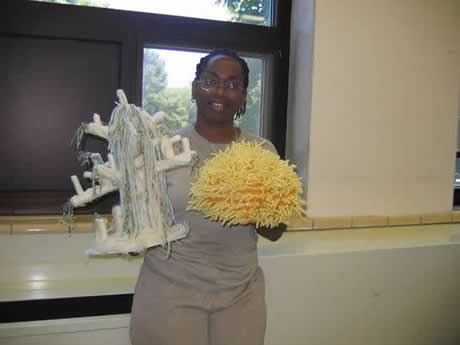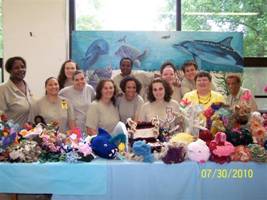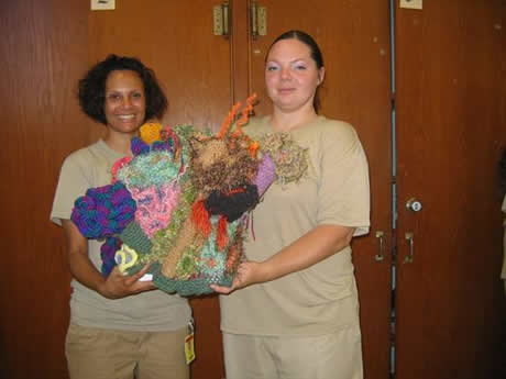 Many of the women in the Workshop were already familiar with crochet, as they regularly produce hats, scarves, mittens, and blankets for the homeless and the Veteran's Hospital. However, the CCR brought a new sense of play to the women's work. They chose yarn from the prison's supplies and brainstormed ideas for the Reef. In between each of the three visits Carol made to the State Prison, the crafters produced a plethora of animated coral and creatures.